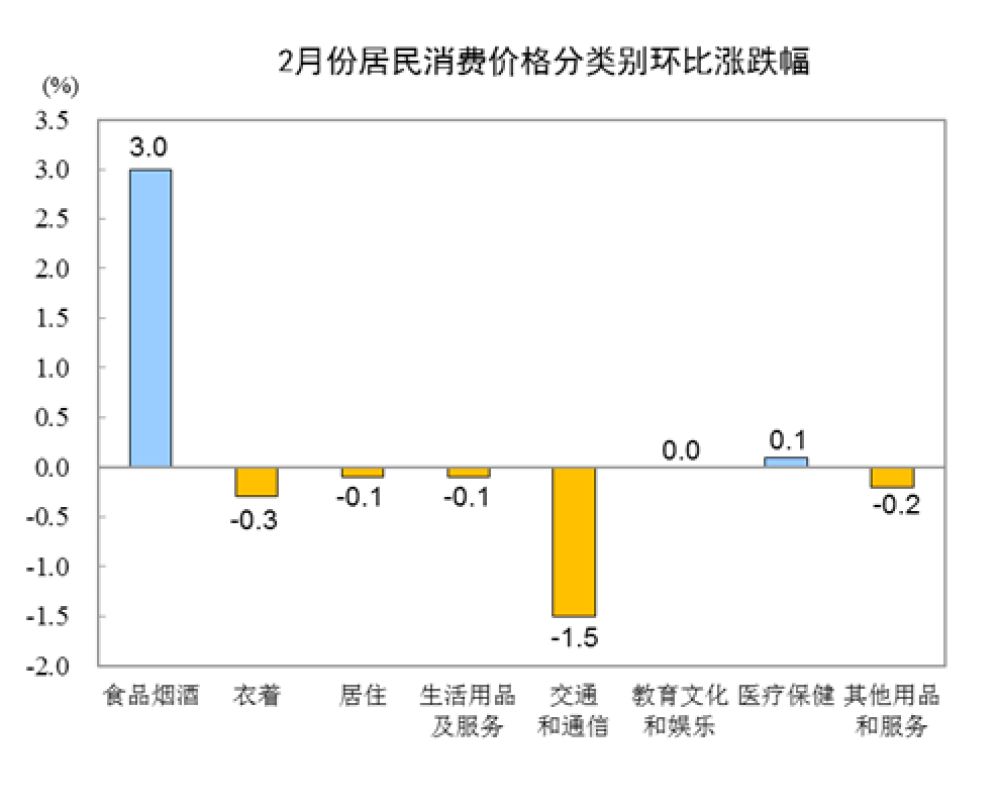 图片来源:国家统计局网站 二、各类商品及服务价格环比变动情况 2月份,食品烟酒类价格环比上涨3.0%,影响CPI上涨约0.99个百分点。食品中,鲜菜价格上涨9.5%,影响CPI上涨约0.28个百分点;畜肉类价格上涨7.1%,影响CPI上涨约0.53个百分点,其中猪肉价格上涨9.3%,影响CPI上涨约0.45个百分点;鲜果价格上涨4.8%,影响CPI上涨约0.08个百分点;水产品价格上涨3.0%,影响CPI上涨约0.05个百分点;蛋类价格下降5.8%,影响CPI下降约0.04个百分点。 其他七大类价格环比一涨一平五降。其中,医疗保健价格上涨0.1%;教育文化和娱乐价格持平;交通和通信、衣着、其他用品和服务价格分别下降1.5%、0.3%和0.2%,居住、生活用品及服务价格均下降0.1%。