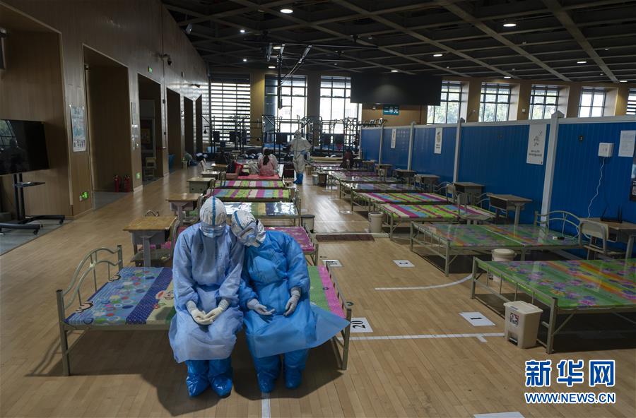 3月10日,武昌方舱医院最后一批痊愈病人共49人出舱。这是两名青海医疗队队员等待出舱时小憩。 新华社记者 肖艺九 摄