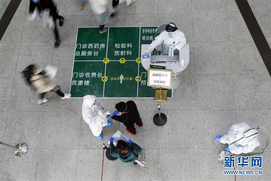 3月16日,在武汉大学人民医院门诊大厅入口,患者有序排队,测量体温后方可进入。疫情期间,该医院一直有部分门诊正常开放。3月6日后,更多门诊开始恢复。每天门诊接诊量有600人左右,多的时候有700多人。新华社记者 沈伯韩 摄