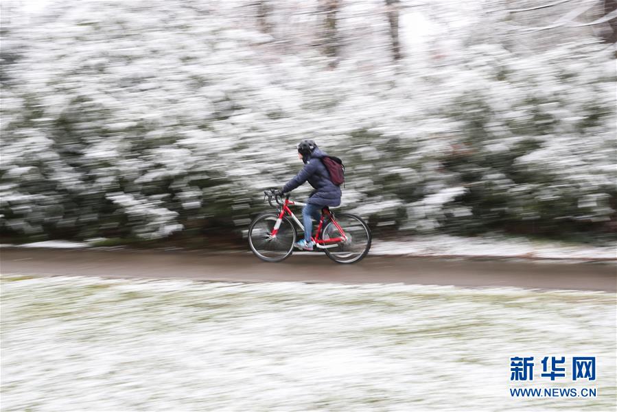 3月30日,在德国首都柏林的一个公园内,一名女子在雪中骑车。 当日,已是初春的德国柏林迎来一场较大规模的降雪。 新华社记者 单宇琦 摄