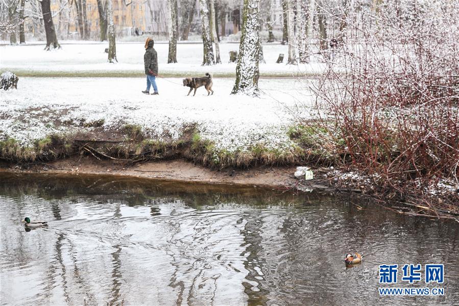 3月30日,在德国首都柏林的一个公园内,一名行人在河边遛狗。 当日,已是初春的德国柏林迎来一场较大规模的降雪。 新华社记者 单宇琦 摄