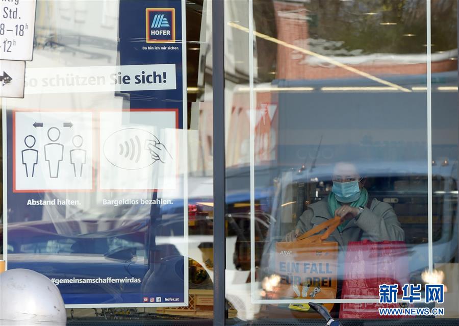 4月1日,在奥地利维也纳,一名佩戴口罩的女子在一家超市内购物。新华社记者 郭晨 摄
