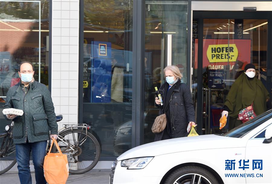 4月1日,在奥地利维也纳,佩戴口罩的人们走出超市。新华社记者 郭晨 摄