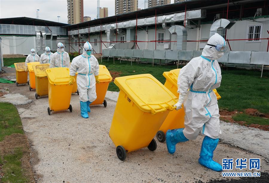 3月30日,火神山医院工作人员在转运垃圾。 新华社记者 王毓国 摄