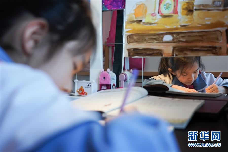 4月13日,北京市朝阳师范学校附属小学(西坝河校区)三年级学生马紫涵在家中按照新学期课表预习语文课程。新华社记者 鞠焕宗 摄