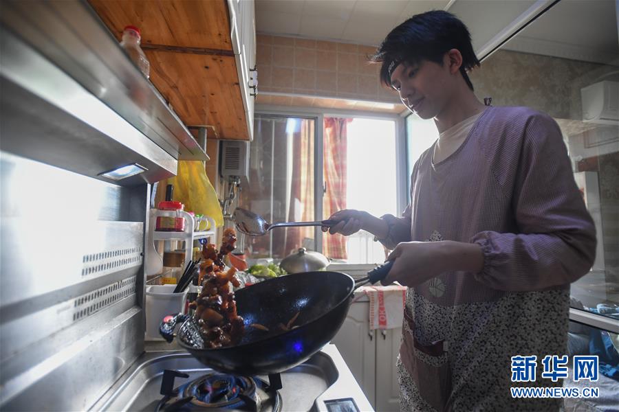 易俊丰在出租房里制作红烧肉(4月23日摄)。 新华社记者 陈泽国 摄
