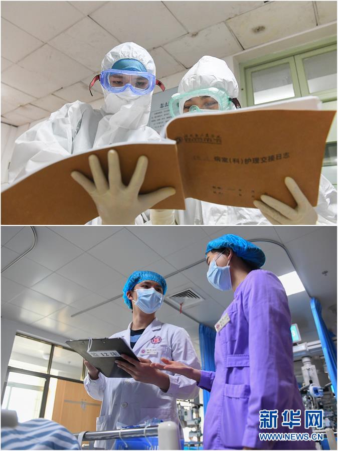 拼版照片:上图为2月7日,易俊丰(左)在湖南省人民医院发热门诊与夜班护士曹颖交接工作;下图为4月22日,易俊丰(左)在湖南省人民医院神内一科重症监护室与白班护士黄飞交接工作。新华社记者 陈泽国 摄