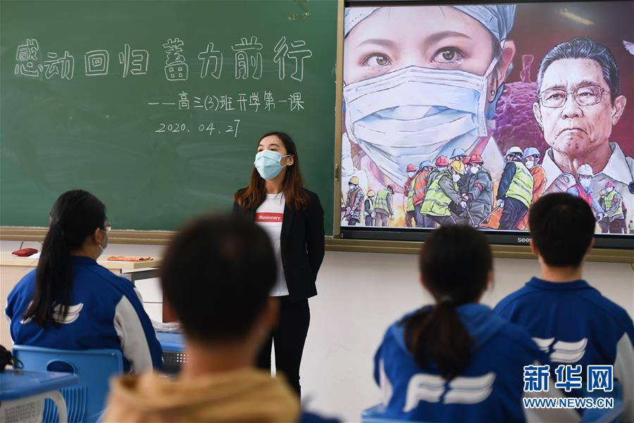 4月27日,北京市丰台二中高三年级3班的班主任为学生讲开学第一课。 当日,北京市高三年级学生开学复课。 新华社记者 鞠焕宗 摄