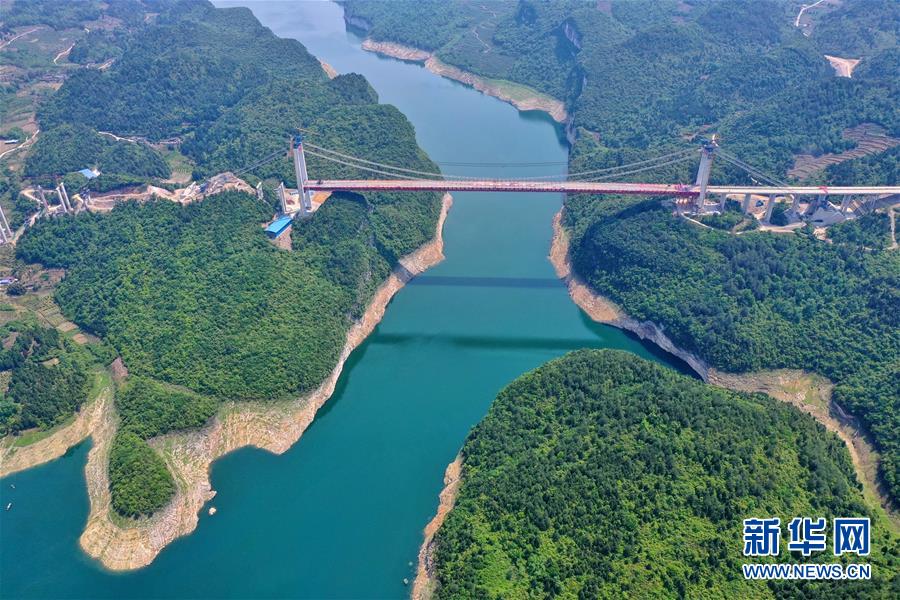 合龙后的遵余高速飞龙湖乌江大桥(4月29日摄,无人机照片)。 4月29日,由中铁大桥局承建的贵州遵余高速飞龙湖乌江大桥正式合龙。飞龙湖乌江大桥是遵余高速控制性工程,全长1.24公里,为主跨680米的钢桁梁悬索桥。 新华社记者 刘续 摄