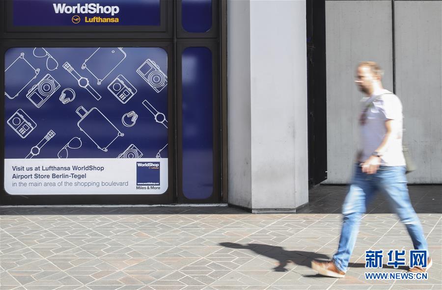 5月26日,在德国首都柏林的泰格尔机场,一名行人经过汉莎航空的广告。 德国联邦财政部5月25日发布新闻公告说,德国联邦政府同意通过经济稳定基金向汉莎航空集团提供90亿欧元救助。 新华社记者 单宇琦 摄