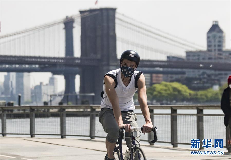 5月26日,在美国纽约,一名男子在布鲁克林大桥附近骑行。 美国约翰斯·霍普金斯大学26日发布的新冠疫情最新统计数据显示,截至26日20时32分(北京时间27日8时32分),美国确诊病例达1680625例,死亡病例为98902例。 新华社记者 王迎 摄