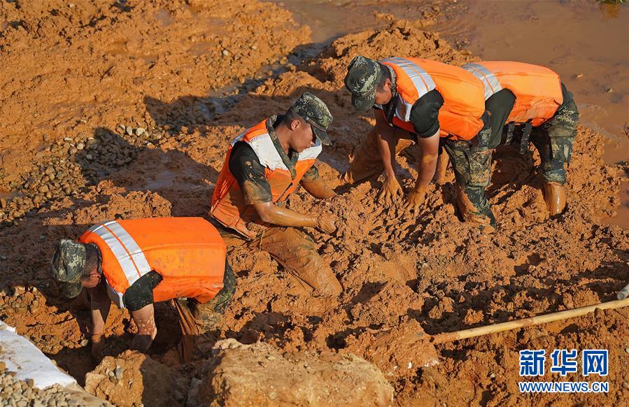 武警江西总队上饶支队的官兵在泥水中开挖导渗沟(7月14日摄)。 开挖导渗沟、填埋沙石、疏通排水渠、垒填沙袋,汗水划过脸颊,浸湿军装。在位于江西省余干县古埠镇的齐埠联圩上,武警江西总队上饶支队的60名战士头顶烈日,挥汗如雨,在泥水中处置一处堤坝坍塌险情。在这群平均年龄只有21岁的年轻战士中,最小的只有18岁,其中“00”后战士就有27人。在汗水与泥水的交织中,记者用镜头记录下这些最可爱的身影。 新华社记者 万象 摄