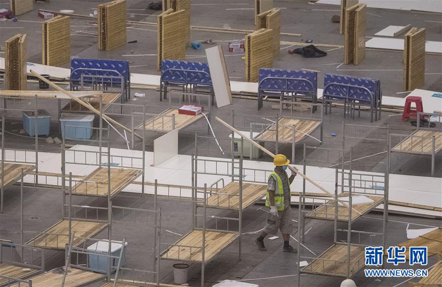 7月29日,工人对武汉客厅方舱医院进行拆除作业,预计工作需要两三天完成。