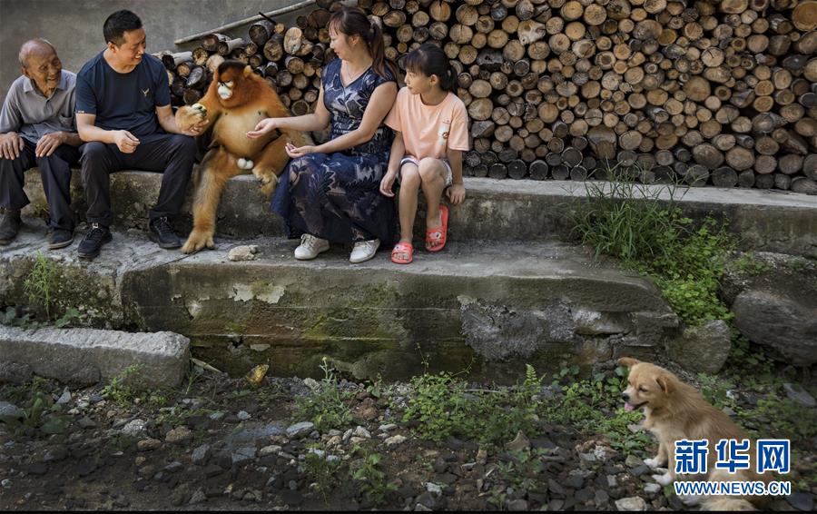 8月2日,下山“串门”的金丝猴与洋县茅坪镇茅坪村村民在一起。 新华社记者 陶明 摄