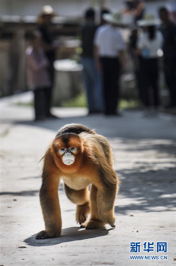 8月2日,下山“串门”的金丝猴离开洋县茅坪镇茅坪村,返回山林中。 新华社记者 陶明 摄