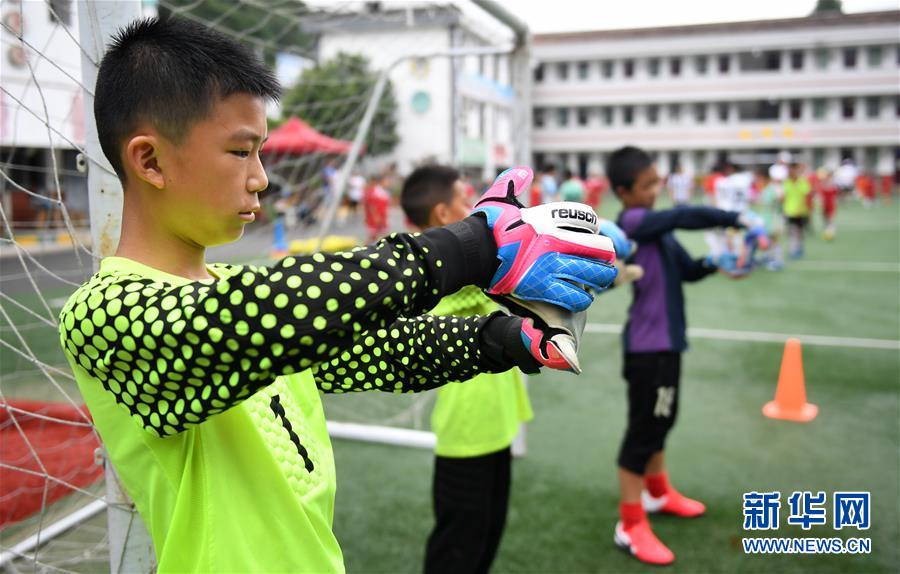 8月4日,陕西省留坝县的小球员李旭尧(前)在位于秦岭南麓的武关驿镇中心小学进行足球暑期集训。新华社记者 李一博 摄