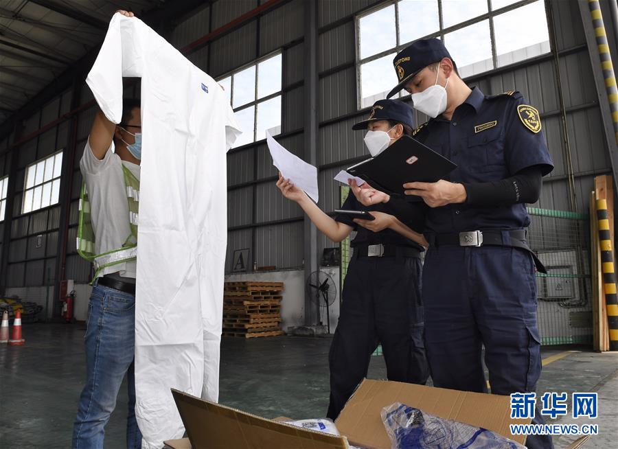 7月17日,成都海关所属青白江海关关员在查验即将运往海外的防疫物资。 新华社记者 刘坤 摄