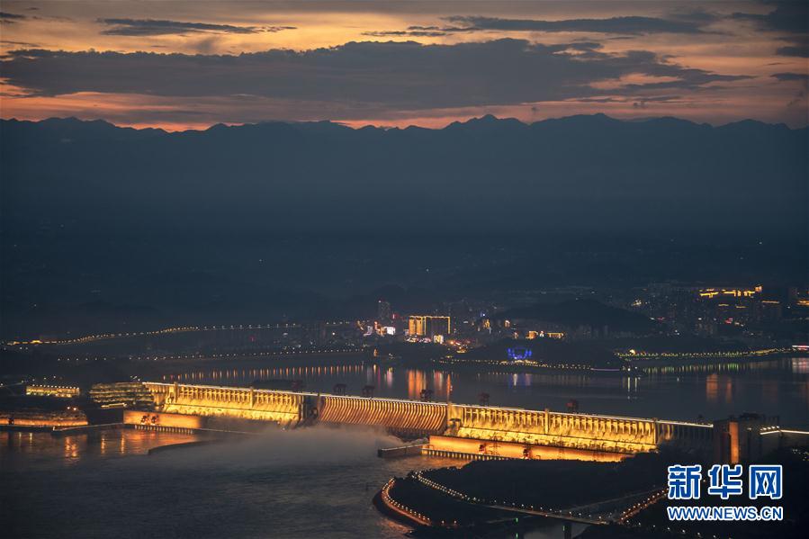 8月1日拍摄的三峡工程夜色。 入夜,三峡工程景观灯开放,整个景区更加壮丽多彩。 新华社记者 杜华举 摄