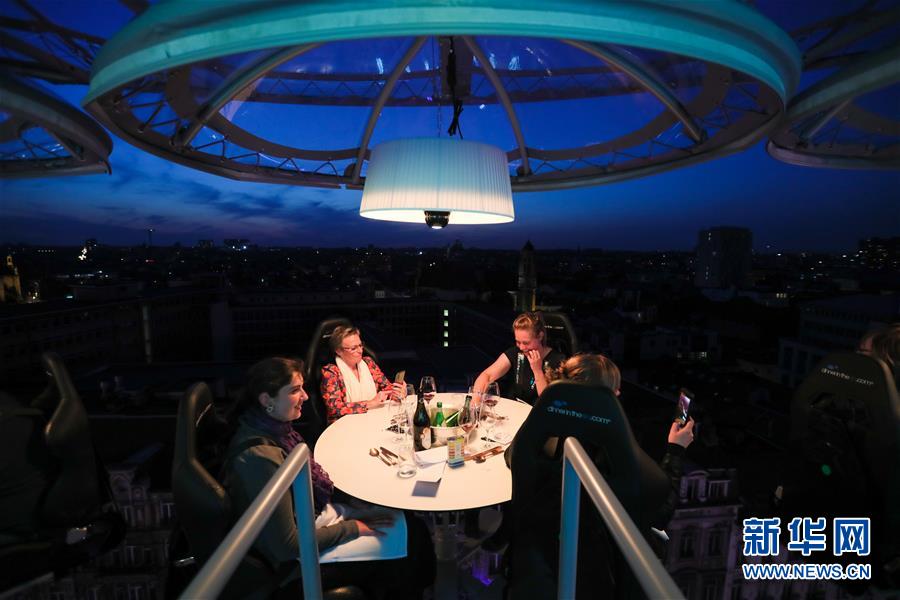 9月18日,食客在比利时首都布鲁塞尔体验“空中餐厅”。 近日,“空中餐厅”在比利时首都布鲁塞尔市中心营业。 “空中餐厅”概念于2006年起源于比利时,迄今已在许多国家和地区铺设过餐桌。今年的布鲁塞尔“空中餐厅”最高可升至约50米,设有8个独立餐桌,可在遵守“社交距离”的规则下容纳32名食客,每人就餐需要花费295欧元(约合2369元人民币)。 新华社记者 郑焕松 摄