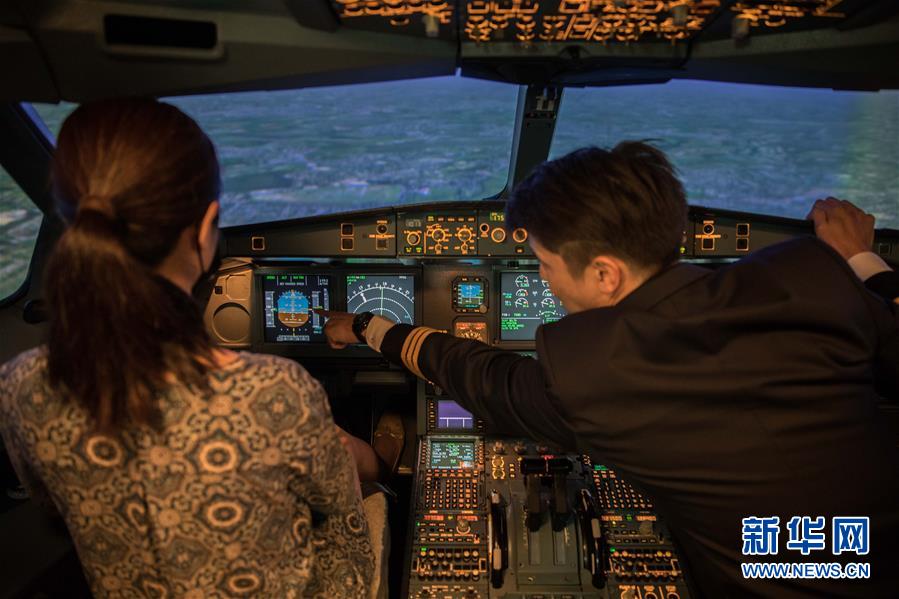 9月24日,一名女子在泰国泰航曼谷总部大楼体验飞行模拟器。新华社记者 张可任 摄