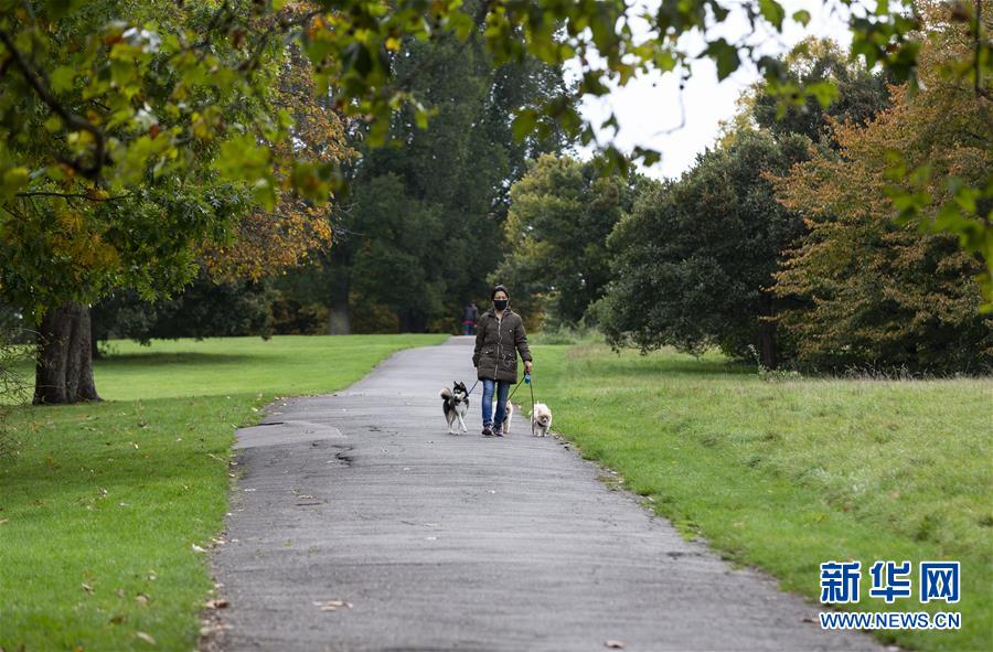 10月12日,一名女子戴口罩在英国伦敦一处公园遛狗。 英国政府11日报告显示英国新冠累计确诊病例已超过60万例。 新华社记者 韩岩 摄