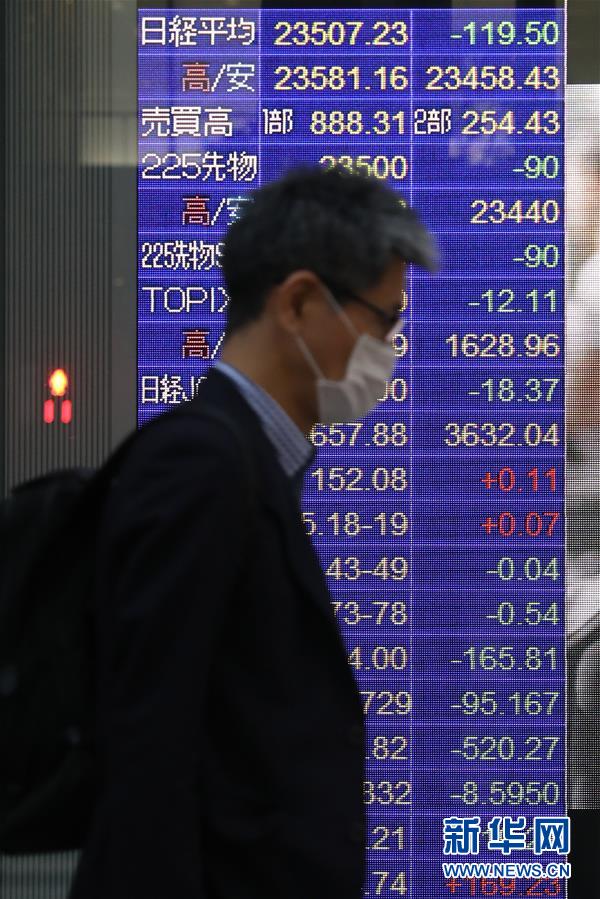 10月15日,行人经过日本东京街头一处电子股指显示屏。 东京股市两大股指15日小幅下跌,日经225种股票平均价格指数收盘下跌0.51%,东京证券交易所股票价格指数下跌0.74%。至收盘时,日经股指下跌119.50点,收于23507.23点;东证股指下跌12.11点,收于1631.79点。 新华社记者 杜潇逸 摄