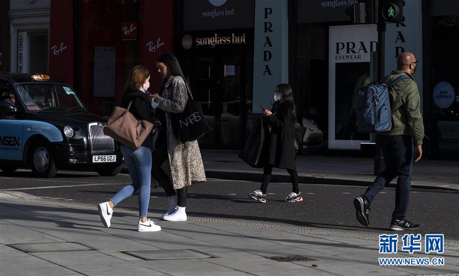 10月15日,人们在英国伦敦的商业街牛津街上行走。 英国政府15日宣布,经过对新冠疫情形势的评估,决定把伦敦等地区的新冠警戒级别从“中等”提升至“高”,这些地区相应地也会采取更严格的防控措施。 新华社记者韩岩摄