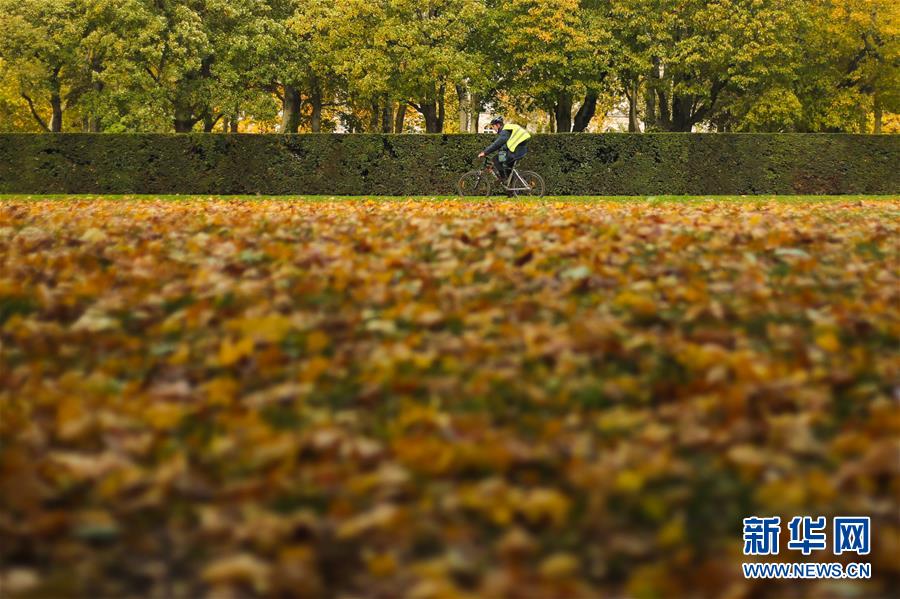 10月21日,一名男子在比利时布鲁塞尔的五十周年纪念公园骑车。 时下的比利时首都布鲁塞尔正值秋季,景色迷人。 新华社记者 郑焕松 摄