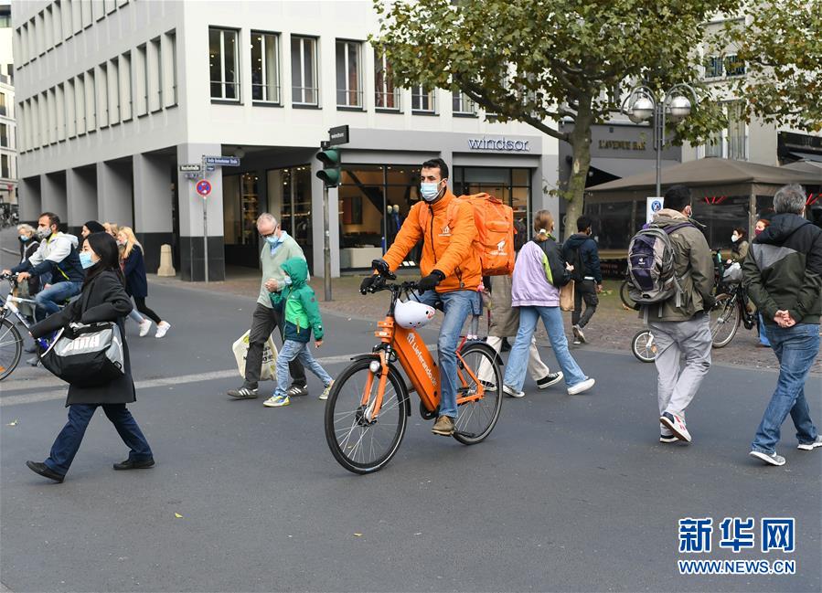 10月24日,在德国法兰克福,人们戴口罩走过马路。 德国疾控机构罗伯特·科赫研究所24日公布的数据显示,截至当天零时,德国较前一日新增新冠确诊病例14714例,累计确诊418005例;新增死亡49例,累计死亡10003例。 新华社记者 逯阳 摄