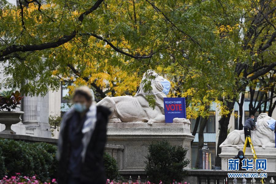 11月2日,行人经过美国纽约公立图书馆外鼓励投票的广告。 11月3日选举日临近,美国大选进入倒计时,纽约街头布置多处广告,鼓励人们参与投票。 新华社记者 王迎 摄