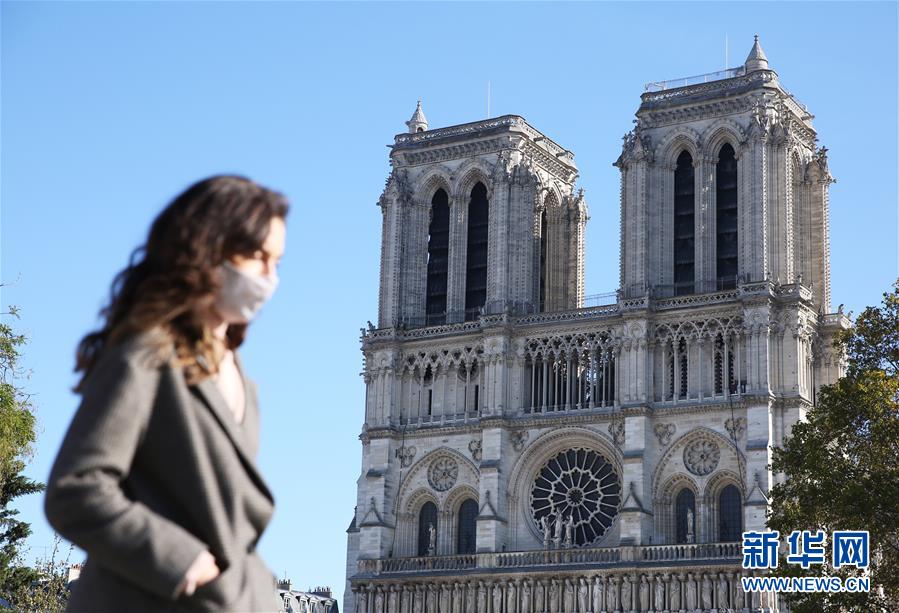 11月9日,在法国巴黎,一名女子从修复中的巴黎圣母院附近经过。 法国国民议会7日投票通过了延长“卫生紧急状态”的法案,“卫生紧急状态”将延长至2021年2月16日。 新华社记者 高静 摄