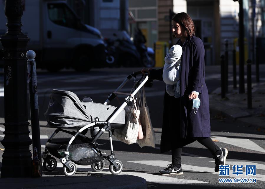 11月9日,一名女子推婴儿车走在巴黎街头。 法国国民议会7日投票通过了延长“卫生紧急状态”的法案,“卫生紧急状态”将延长至2021年2月16日。 新华社记者 高静 摄