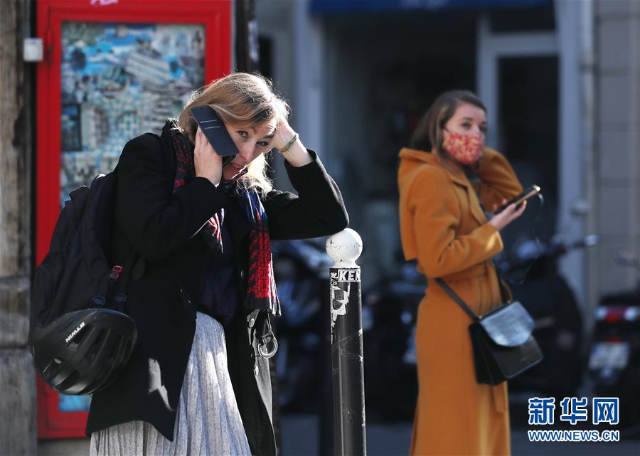 11月9日,一名女子在法国巴黎街头打电话。 法国国民议会7日投票通过了延长“卫生紧急状态”的法案,“卫生紧急状态”将延长至2021年2月16日。 新华社记者 高静 摄