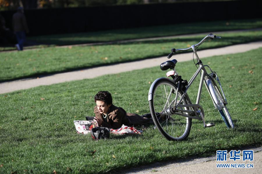 11月18日,在比利时布鲁塞尔,一名女子在公园休憩。
