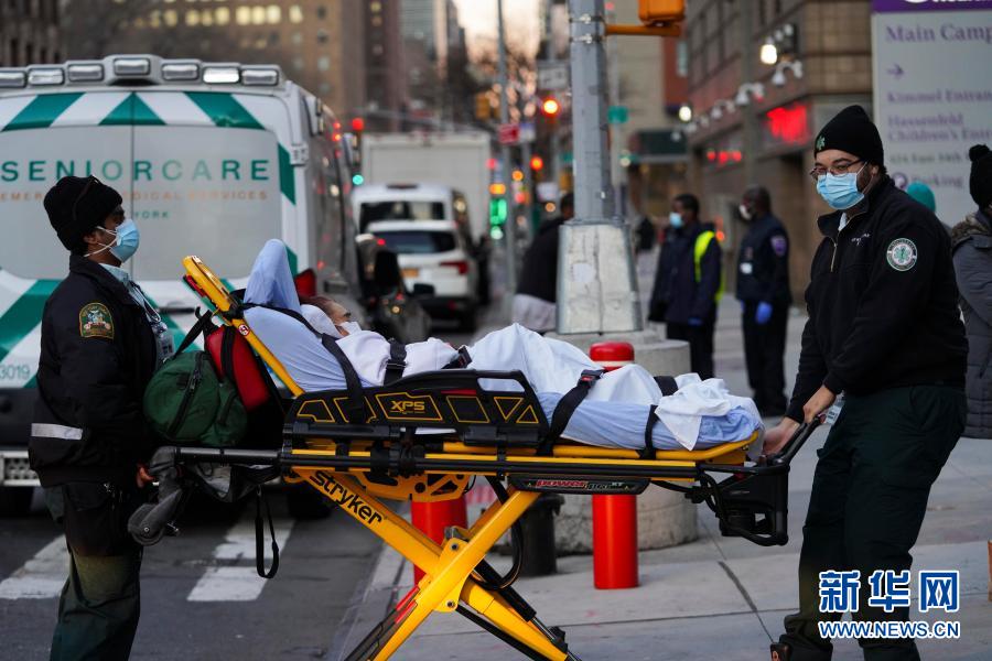 12月8日,医护人员在美国纽约一家医院外运送病人。