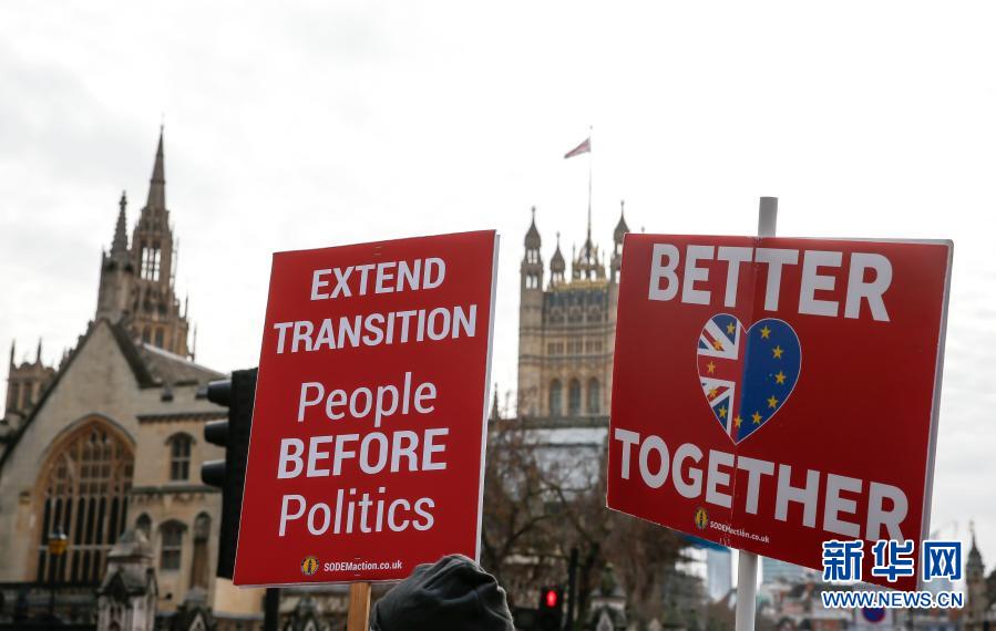 12月9日,反对“脱欧”的示威者手举标语牌站在英国伦敦议会大厦外。