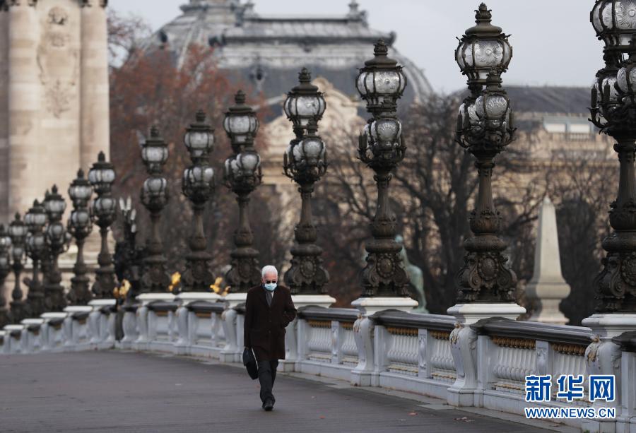 12月9日,一名戴口罩的男子走在法国巴黎亚历山大三世桥上。
