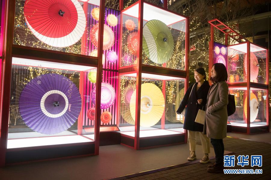 2018年12月30日,在日本东京,游客在名为“东京巨蛋城”的商业设施中欣赏日本文化主题的彩灯。