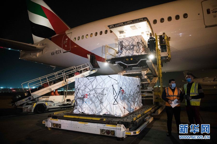 12月10日,在埃及开罗国际机场,工作人员运输中国研制生产的新冠疫苗。新华社记者邬惠我摄