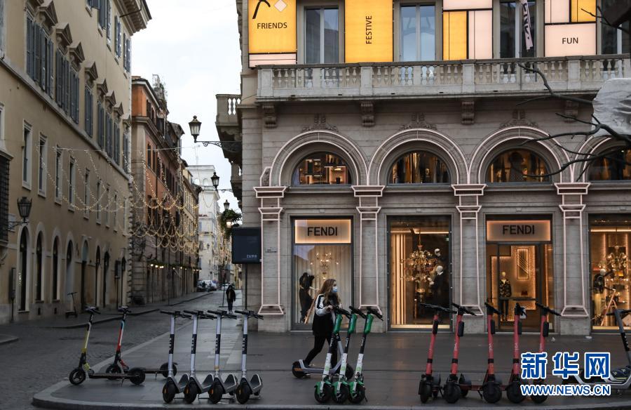 12月24日,在意大利罗马,一名女子推着电动滑板车经过关闭的店铺。