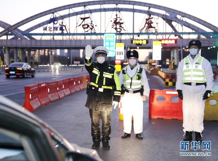 1月10日,石家庄市公安局高新技术产业开发区公安分局民警在藁城区通往市区的路口执勤。 为阻断疫情扩散蔓延,河北省石家庄市公安战线的民警坚守岗位,奋战在抗击疫情一线,度过第一个中国人民警察节。 新华社记者 杨世尧 摄