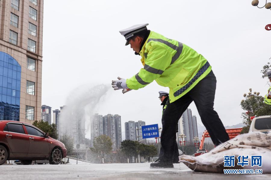 1月11日,交警在盘州市蛾螂铺大桥进行临时交通管制,准备进行撒盐除冰作业。新华社记者 欧东衢 摄