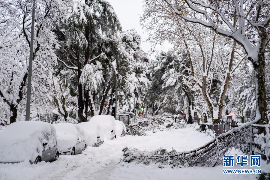 这是1月10日在西班牙马德里近郊拍摄的被雪压断的树枝。新华社记者 孟鼎博 摄