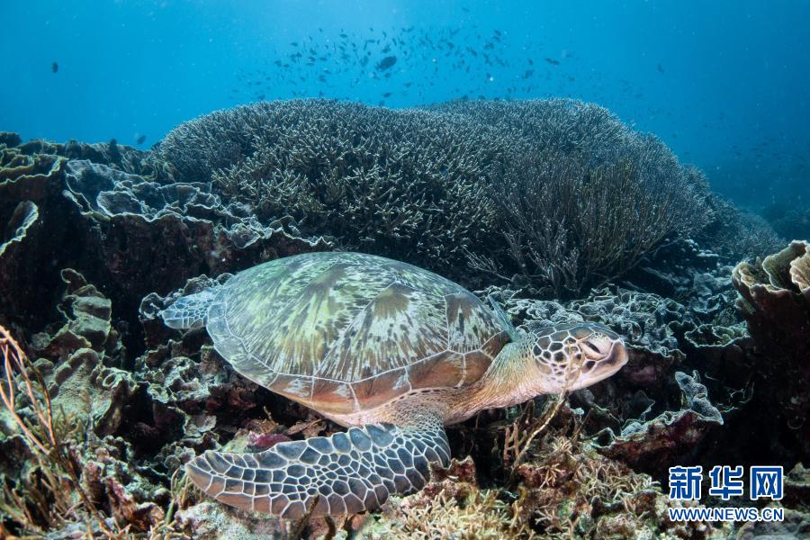 2018年10月26日,在印度尼西亚科莫多国家公园海域,一只海龟在珊瑚丛中休息。科莫多国家公园位于印度尼西亚东努沙登加拉省,由3个大岛和26个小岛组成。