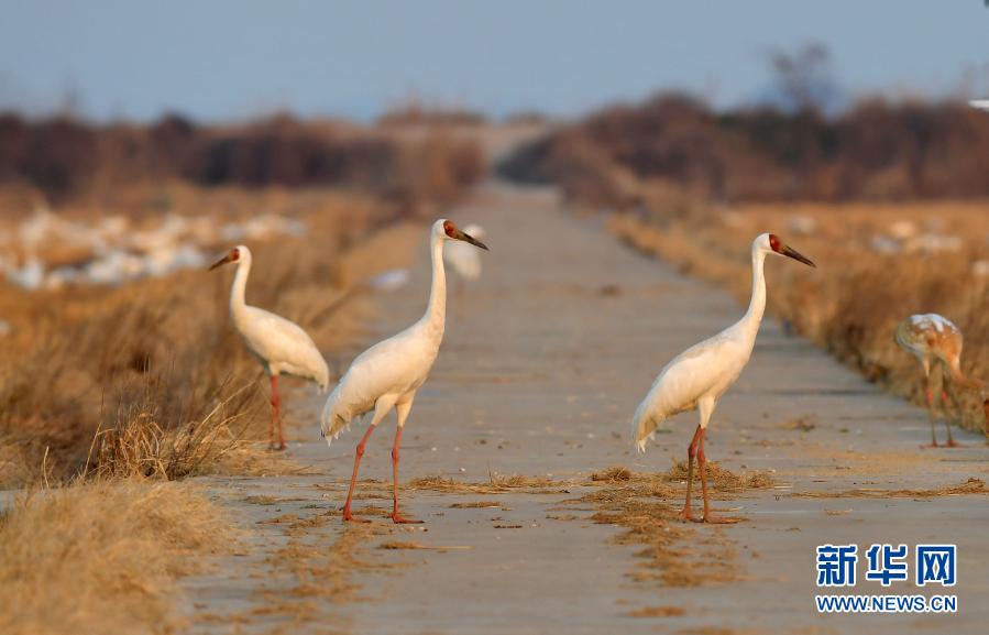 在江西省余干县康山垦殖场插旗洲,几只白鹤在稻田间漫步(1月15日摄)。