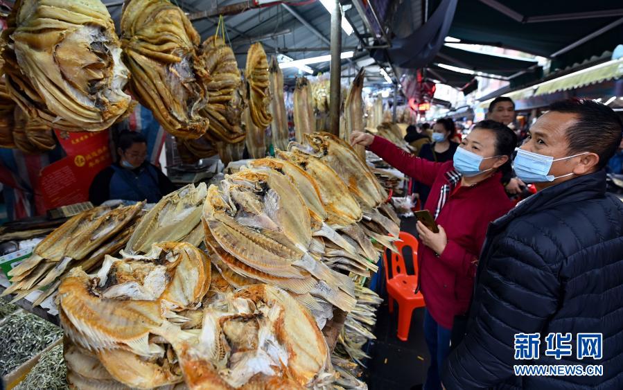 1月30日,市民在海口市东门市场选购海鲜干货。新华社记者 郭程 摄
