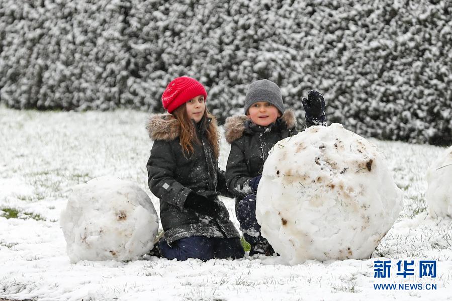 2月7日,孩子们在比利时布鲁塞尔的五十周年纪念公园玩雪。