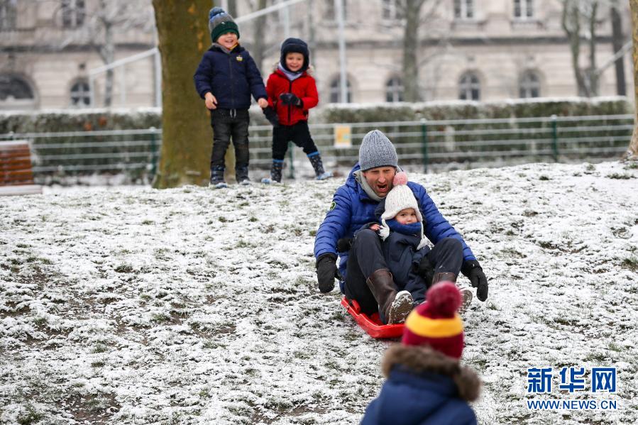当日,比利时首都布鲁塞尔迎来降雪天气,众多市民外出赏雪、游玩。