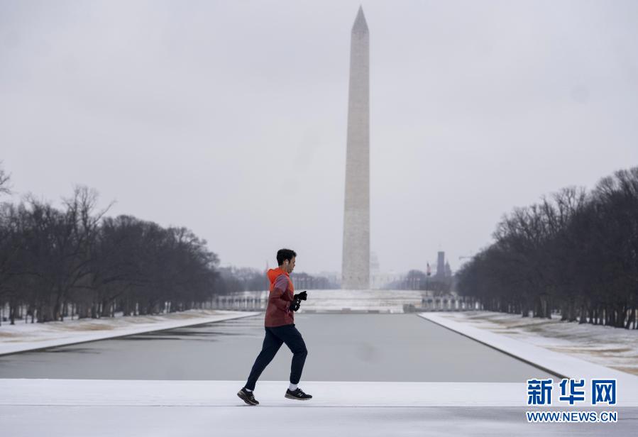 2月18日,一名男子在美国华盛顿的雪地上慢跑。