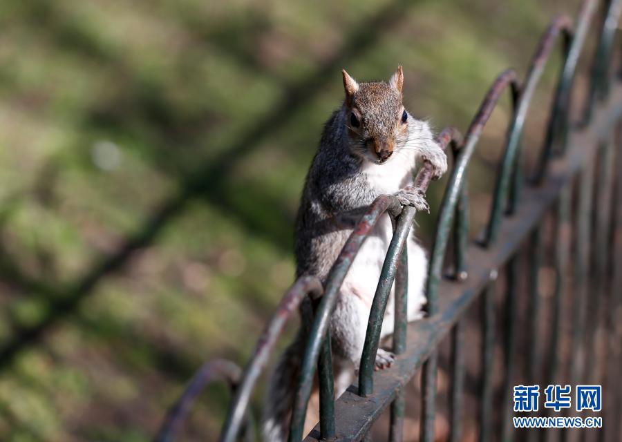 2月26日,一只松鼠趴在英国伦敦圣詹姆斯公园的栏杆上。新华社记者 韩岩 摄